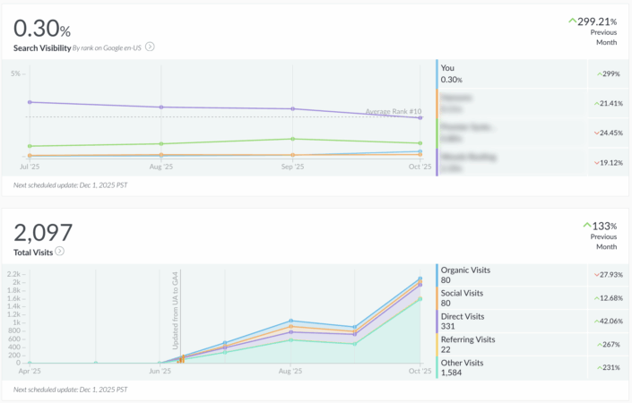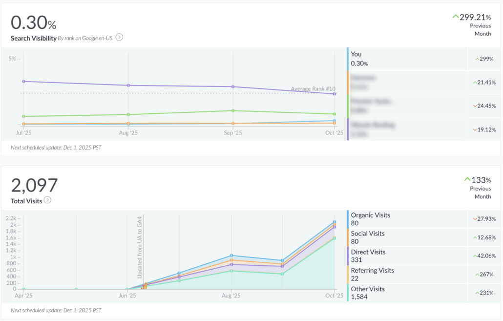 For this manufacturing company with two service locations, increased online visibility was essential to support steady lead flow and regional growth. Through ongoing SEO enhancements and targeted PPC campaigns, we’ve strengthened their digital presence, increasing search visibility by 242%, boosting website traffic by 80%, and securing the #1 Google ranking for their core manufacturing service terms.